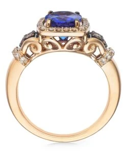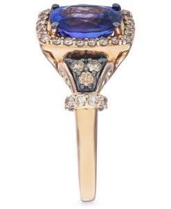 A striking cushion-cut Blueberry Tanzanite® (2 ct. t.w.) makes a cool contrast to the warm tones of Le Vian®’s Nude™ (1/3 ct. t.w.) and Chocolate Diamonds® (1/8 ct. t.w.) set in rich 14k Strawberry Gold®
