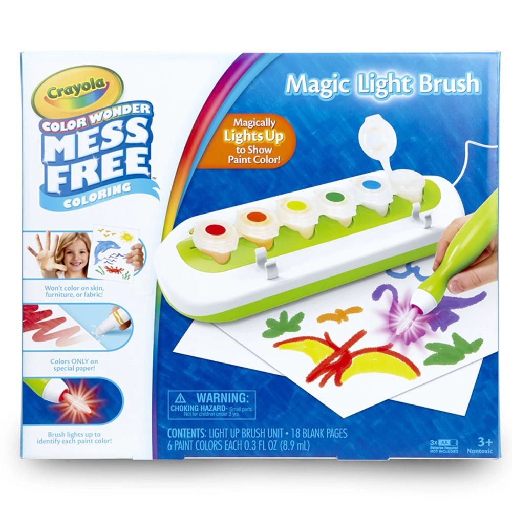Create colorful art without the mess! Crayola® Color Wonder™ Magic Light Brush lets kids create amazing mess-free art in a magical way. While Color Wonder paints are clear—and therefore won’t mark or stain furniture, carpet or skin—the color magically appears when applied to the special paper. But kids don’t need to know the color of clear paint because the Magic Light Brush lights up in the color of paint they’re using! It changes color from blue to green to red whenever you change paints.