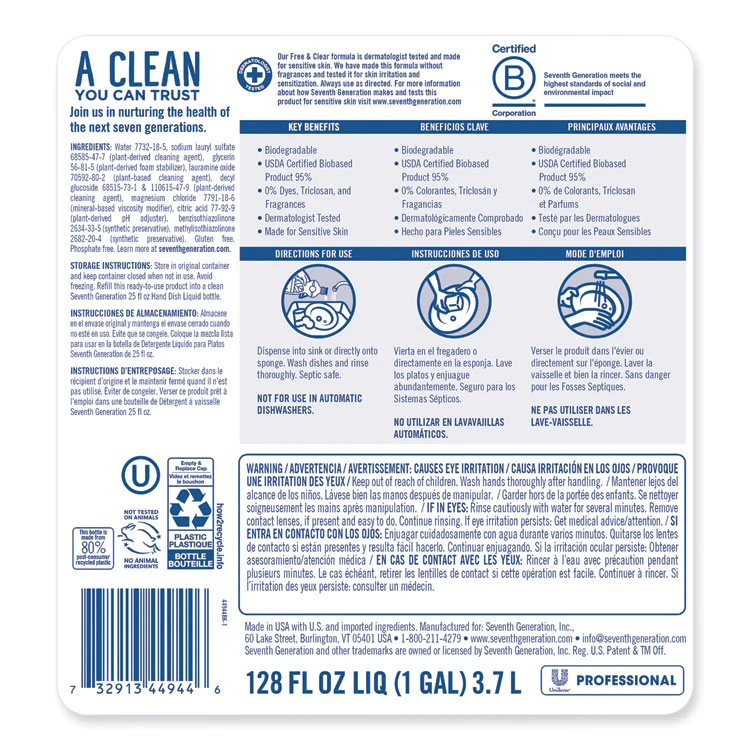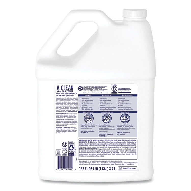 Seventh Generation Professional Dish Liquid cuts through grease and powers away tough residue. Free and clear formula made with no artificial fragrances, dyes and triclosan. Free and clear formula is made of 95% biobased ingredients and is not tested on animals. Dermatologist tested and made for sensitive skin. Bottle is made with 100% recycled plastic. Ideal for commercial and business use including restaurants, offices, school, day care facilities, and hospitality. Not for use in automatic dishwashers.