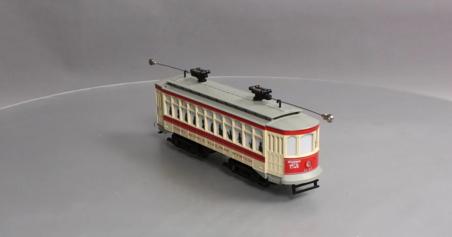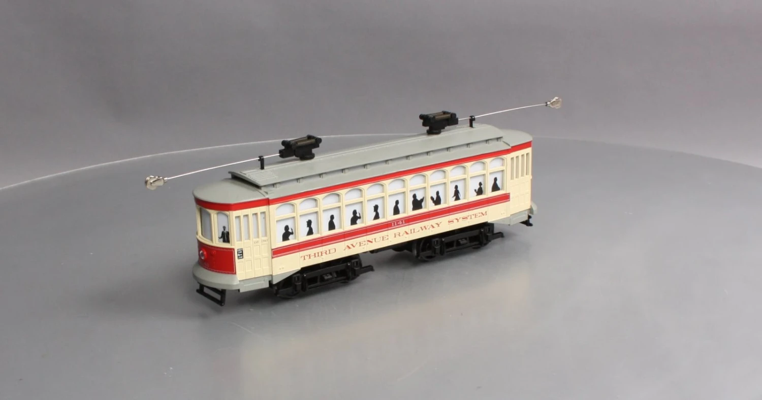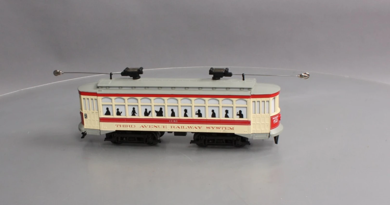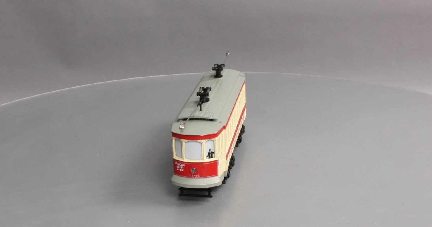 Here is an MTH 30-5106-1 O Gauge New York Transit Brill Trolley w/PS 2.0 #1144. This trolley features directionally controlled headlights, intricately detailed ABS body, metal wheels, metal axles, metal gears, moveable pantograph pole, die-cast trucksides and pilots, colorful paint scheme, precision flywheel equipped motor, locomotive speed control in scale MPH increments, lighted cab interior, illuminated number boards, ProtoSound 2.0 with the Digital Command System featuring Station Stop ProtoEffects.