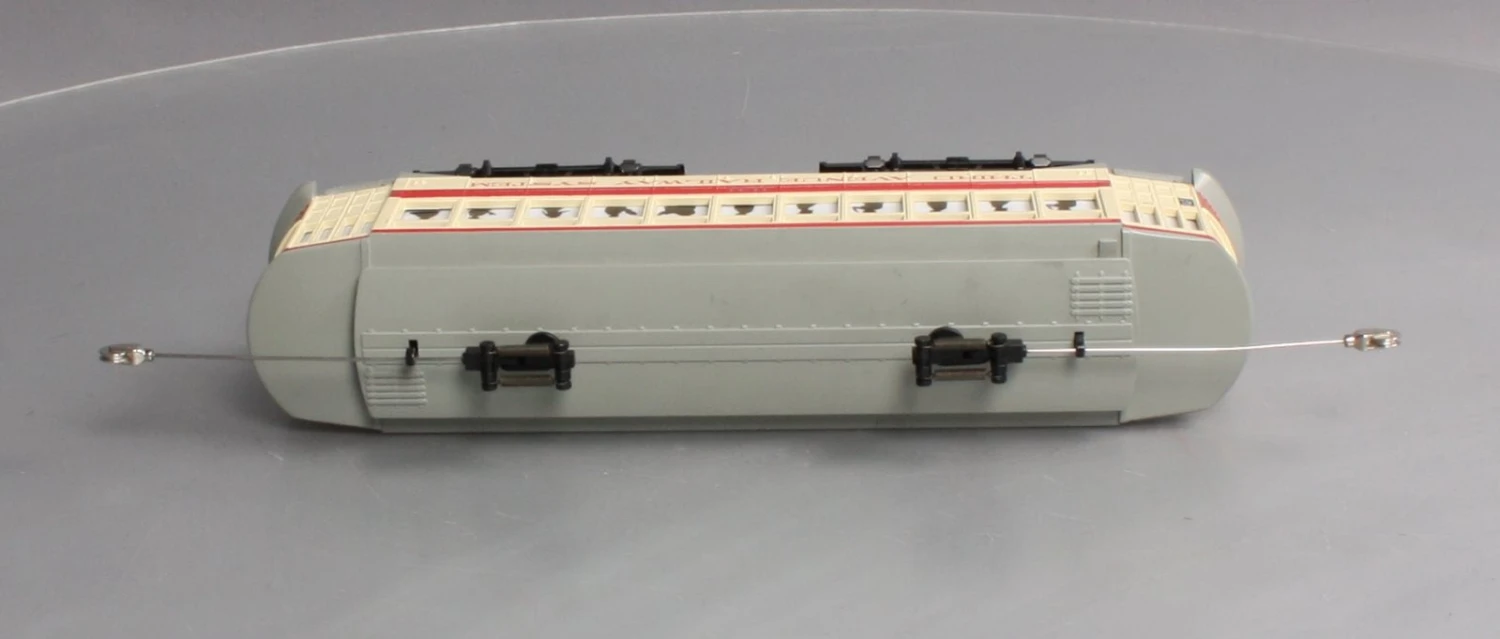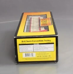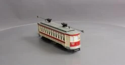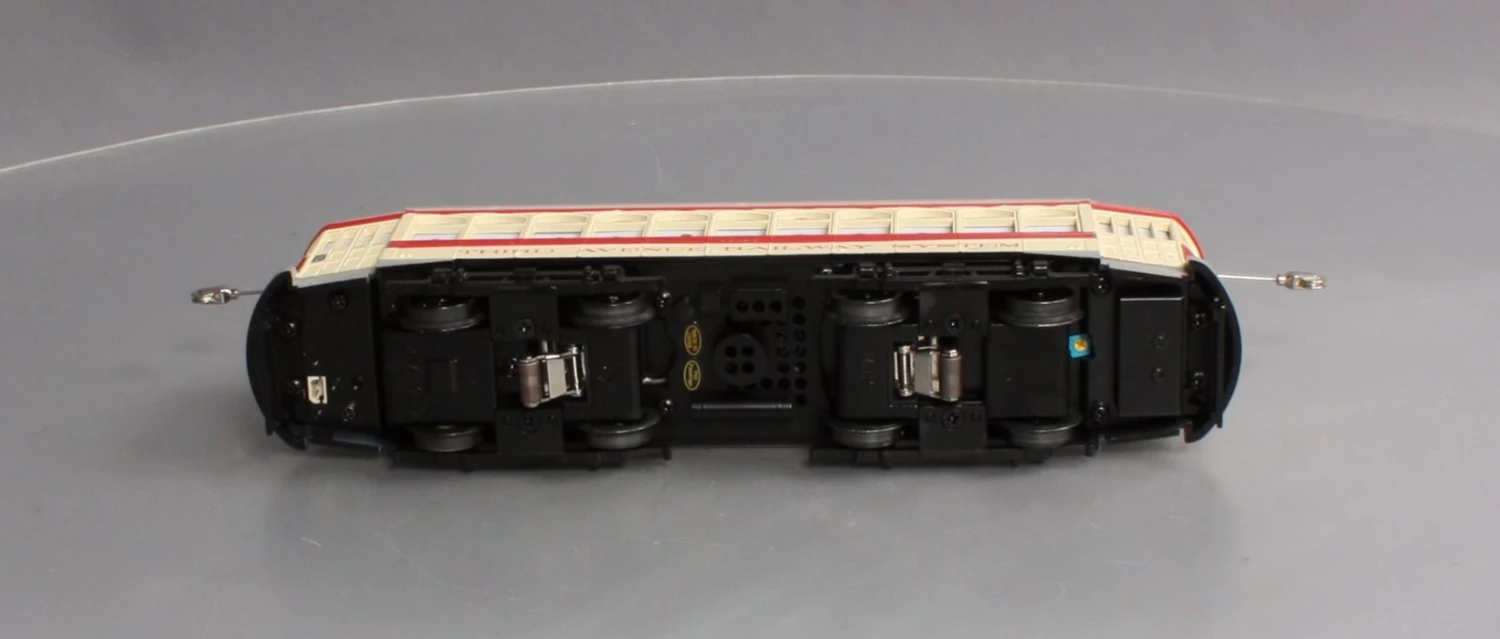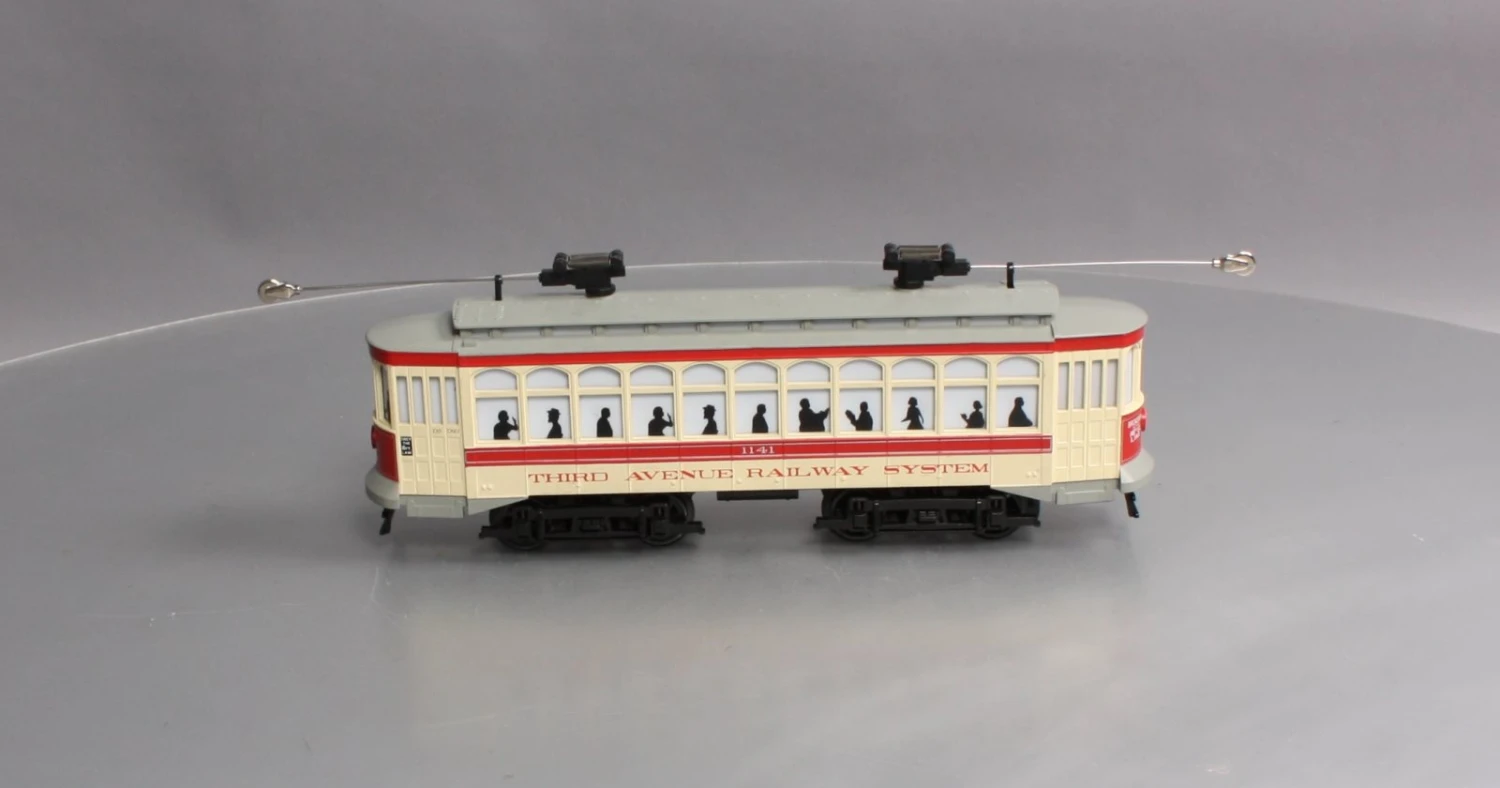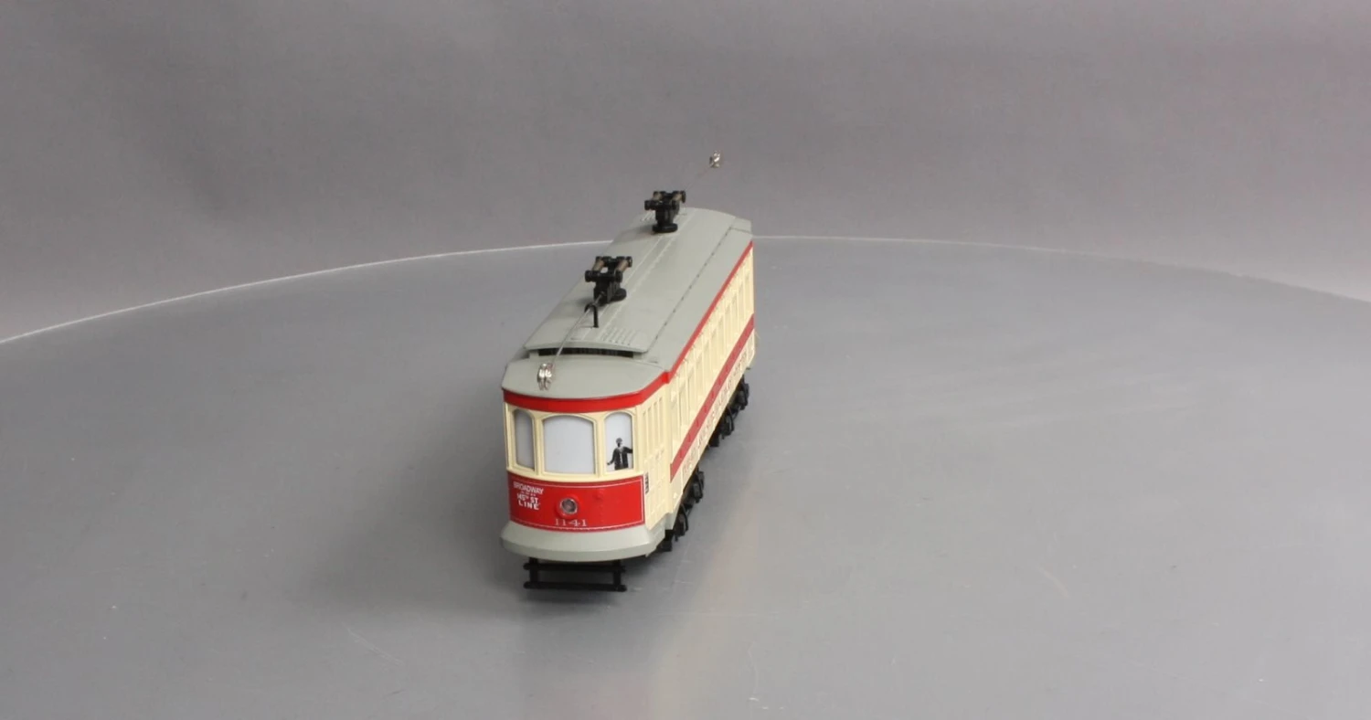 Here is an MTH 30-5106-1 O Gauge New York Transit Brill Trolley w/PS 2.0 #1144. This trolley features directionally controlled headlights, intricately detailed ABS body, metal wheels, metal axles, metal gears, moveable pantograph pole, die-cast trucksides and pilots, colorful paint scheme, precision flywheel equipped motor, locomotive speed control in scale MPH increments, lighted cab interior, illuminated number boards, ProtoSound 2.0 with the Digital Command System featuring Station Stop ProtoEffects.