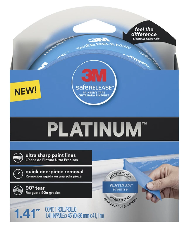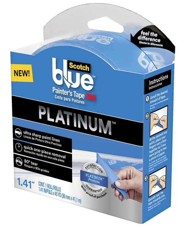 ScotchBlue Platinum Painter’s Tape delivers a unique kind of durability so you can be confident in your results. 3M’s advanced poly material helps stops paint seepage and removes in one easy piece without tearing or slivering. Excellent conformability for curved angles and tough-to-tape areas. Pull off a better paint job with one pull, for professional looking results. Durable, advanced poly material for quick and easy one-piece removal and ultra-sharp paint lines. Unique 90 degree straight-edge tear for fast corner prep.