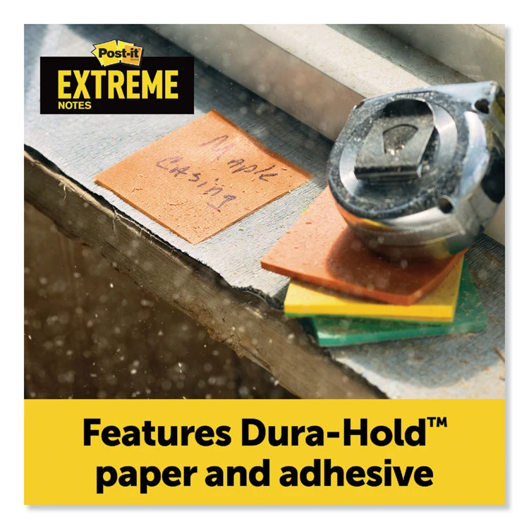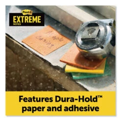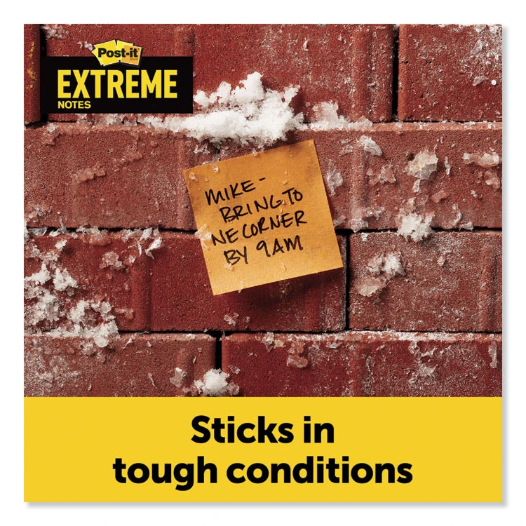When conditions make communication tough, Post-it® Extreme Notes make leaving notes and reminders simple, so you can get the work done. Made with Dura-Hold™ Paper and Adhesive, these notes will hold up in hot, cold and wet conditions. 100X the holding power, they stick to tough and textured surfaces like concrete, raw and painted wood, and tile. Make sure your message is seen with a note that sticks in tough conditions.